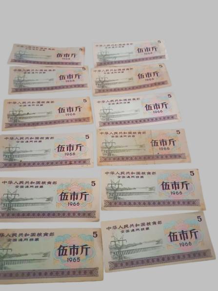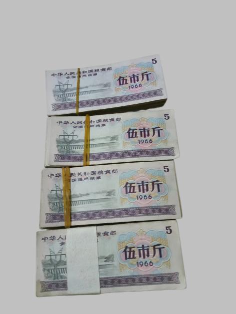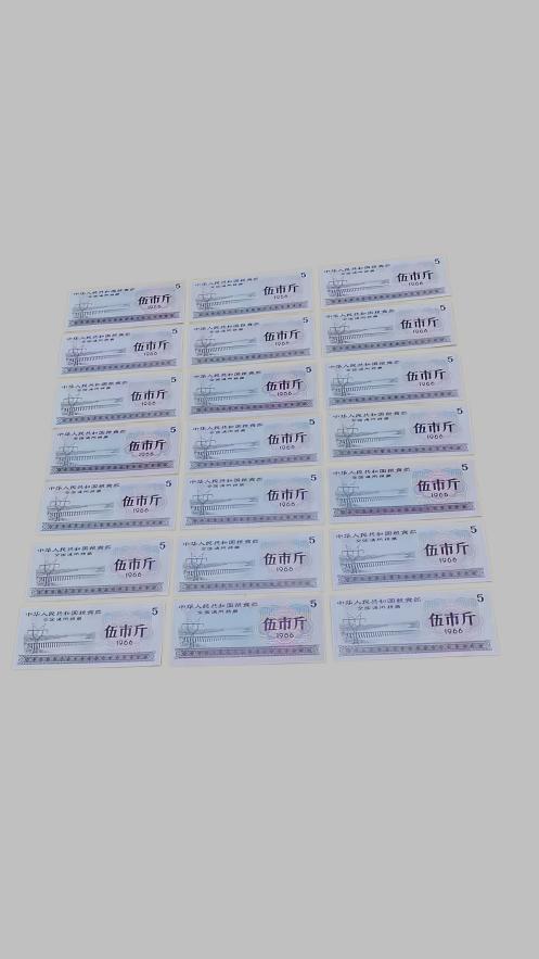 展品介绍:这是20张1966年全国通用粮票,面额为伍市斤,是我国计划经济时期的经典购粮凭证,兼具时代纪念与收藏价值。