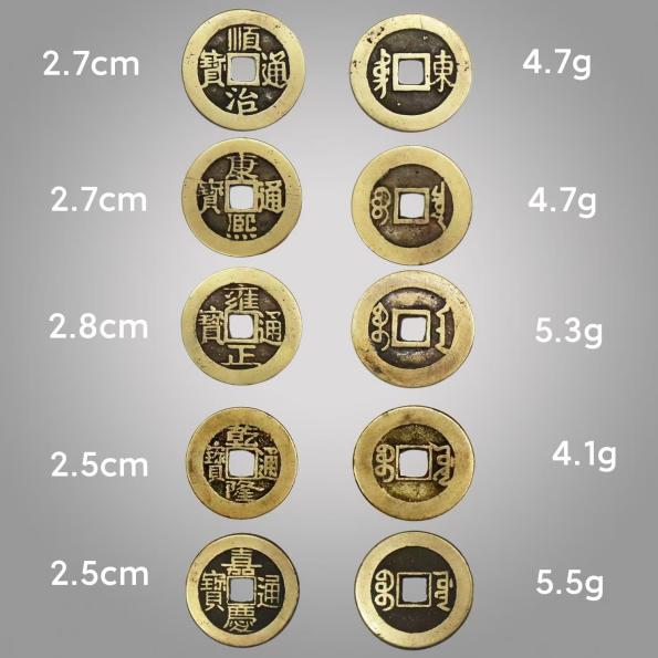 展品介绍:这是一套清代五帝钱,含顺治、康熙、雍正、乾隆、嘉庆通宝,铜质黄亮,尺寸重量标注清晰,是寓意吉祥的古钱币收藏套组。