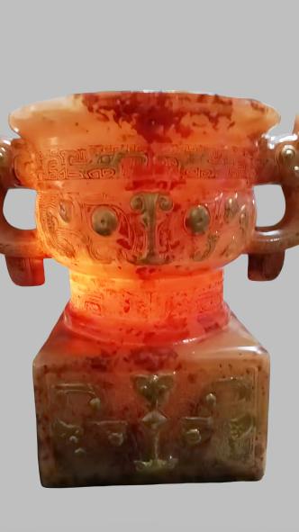 展品介绍:此件高古玉尊以红褐玉料为胎,色泽温润通透,带天然沁色纹理。器形敞口鼓腹,下承方座,两侧为螭龙形双耳,腹部饰描金牛头纹,颈部与器座刻有仿古回纹,整体造型庄重典雅,兼具礼器气度与祥瑞寓意。