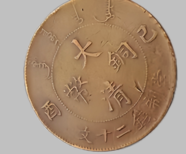 展品介绍:这是一枚清代乙酉年造的大清铜币,面值当制钱二十文,是清末机制铜元中的品类,兼具历史与收藏价值。