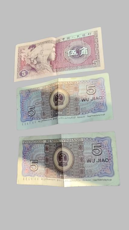 展品介绍:这是第四套人民币 1980 版伍角纸币,属于仍在流通的辅币:正面是苗族、壮族人物头像,背面为国徽与多民族文字,设计充满民族特色。