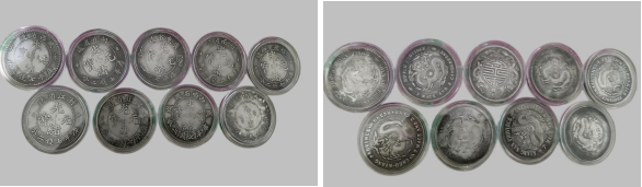 展品介绍:这套钱币是民间俗称的“大清九龙银元”,以清末各省铸造的光绪元宝银币为主。币面铸有龙纹,背面标注各省造币局及库平七钱二分等币值信息,是清代流通银元的代表品类之一。
