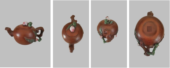 展品介绍:这是陈鸣远款点彩寿桃紫砂壶,以紫砂为胎,壶身仿生寿桃造型,壶流、壶柄与盖钮均以桃枝、寿桃点彩装饰,底部落名家款识,造型生动雅致,尽显文人紫砂意趣。