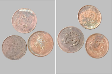 展品介绍:这三枚是清代光绪元宝铜元,为清末各地铸造的流通制钱,正面铸“光绪元宝”字样,背面饰龙纹图案,是近代币制变革的实物遗存。