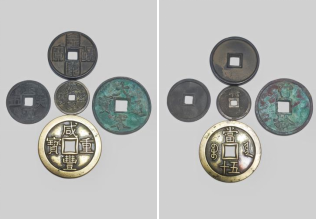 展品介绍:这五枚钱币跨越宋、元、清三代,涵盖北宋国号钱、元代稀见铸币、南宋名珍及清代咸丰大钱,钱文风格多样,形制规整。是中国古代货币演变的实物缩影,兼具历史与收藏价值,是收藏与投资佳品。