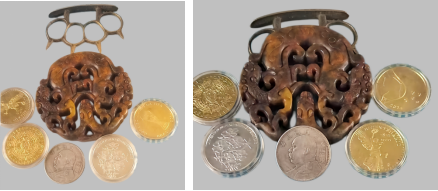 展品介绍:这组藏品包含传统瑞兽纹玉佩、纪念币与老银元,整体风格古朴且文化气息浓厚。中心玉佩呈虎纹或瑞兽镂空造型,材质多为地方玉或古玉,工艺精美,象征辟邪与吉祥寓意。硬币包含纪念币和一枚袁大头类老银元,兼具收藏、投资和历史纪念属性。整套组合把传统玉雕与近现代钱币结合,是兼具文化寓意与收藏价值的综合性藏品。