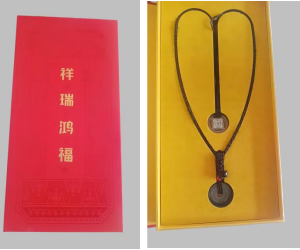 展品介绍:这是一套祥瑞鸿福主题的古钱币挂饰礼盒,主体是一枚封装评级古钱币与一枚方孔老钱,用编绳串成挂饰,寓意 “钱到家”,有招财纳福的吉祥寓意。礼盒包装喜庆大气,既适合日常佩戴装饰,也可作为礼品赠送,兼具收藏价值与民俗文化寓意。