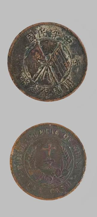 展品介绍:这是中华民国开国纪念币双旗铜元,正面为交叉五色旗与铁血十八星旗,书“中华民国开国纪念币”字样,背面环绕英文“THE REPUBLIC OF CHINA”并标注面值,是民国初年推翻帝制、建立共和的实物见证,兼具历史纪念与收藏价值。